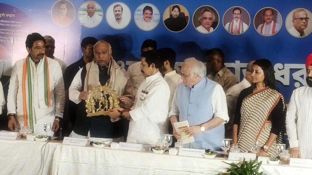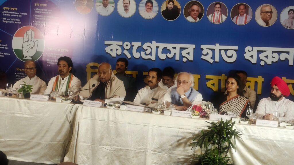 সর্বভারতীয় কংগ্রেসের সভাপতি সরাসরি আসাম সফর থেকে কলকাতার বিমানবন্দরে নামেন।স্বভাবতই নির্ধারিত চারটের অনুষ্ঠান শুরু সন্ধে ছ’টায়।রাজ্য সভাপতি ও রাজ্য নেতৃত্বের সংক্ষিপ্ত বক্তব্যের পর প্রাদেশিক দলীয় ইশতেহারে প্রকাশ করেন কেন্দ্রীয় সভাপতি মল্লিকার্জুন খাড়গে। রাজ্যের সর্বস্তরের নাগরিকের চাহিদার কথা ওর পূরণ করার অঙ্গীকার থাকলেও মূলত পাঁচটি অঙ্গীকার প্রধানত গুরুত্ব পেয়েছে। ১)মহিলাদের মাসে দু’হাজার টাকা দেওয়ার দুর্গা সম্মান,২)বিধানচন্দ্র রায়ের স্মৃতিতে বিধান স্বাস্থ্য সুরক্ষা,যেখানে নাগরিক পিছু দশ লক্ষ টাকার স্বাস্থ্যবিমা ৩);যুব সম্মান প্রকল্পে এক বছরের মধ্যে সরকারি সব শূণ্য পদে নিয়োগ ৪) স্নাতক স্তর পর্যন্ত বিনামূল্যে শিক্ষার আলো প্রকল্পে শিক্ষা ও দক্ষতা উন্নয়ন কেন্দ্র স্থাপন ৫)কৃষক সম্মান প্রকল্পে বছরে ১৫ হাজার টাকা ও মাসে ২০০ ইউনিট বিনামূল্যে বিদ্যুৎ সরবরাহ।